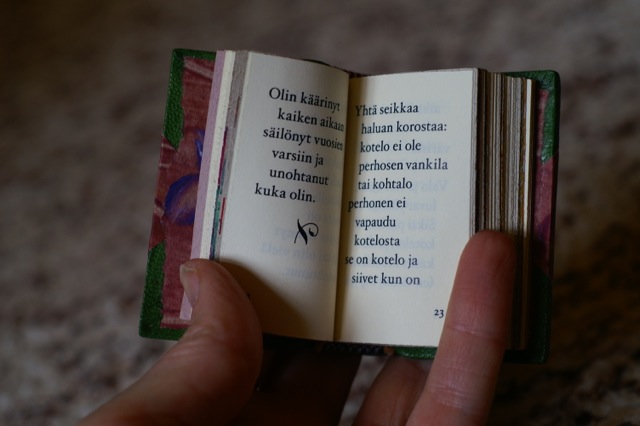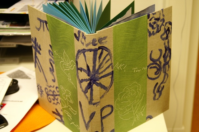 Vielä sananen oho-kirjansidonnasta... Olen kutsunut suhdettani tähän omaan taidelajiini sillä nimellä sen jälkeen, kun kohtasin oho-taidetta tekevän Kaija Juurikkalan. Oho-kirjansidonta, tai oho-taide ylipäätään, vaalii tekemisen yllätyksellisyyttä, kaikkea sitä mikä vain oho sattuu tehdessä syntymään. Oho tulee työhön jostakin, se tulee lahjana kun vain sen lahjaksi tunnistamme, se antaa meille merkityksen joka on aidosti uusi, jota emme olisi muuten osanneet kuvitella. Kirjavillassa siis sanotaan aina autuas oho silloin, kun jokin ei mene suunnitellusti, silloin olemme jonkin meitä suuremman äärellä. (Tämä kaikki pätee ekspressiiviseen taideterapiaan ehdottomasti myös.)